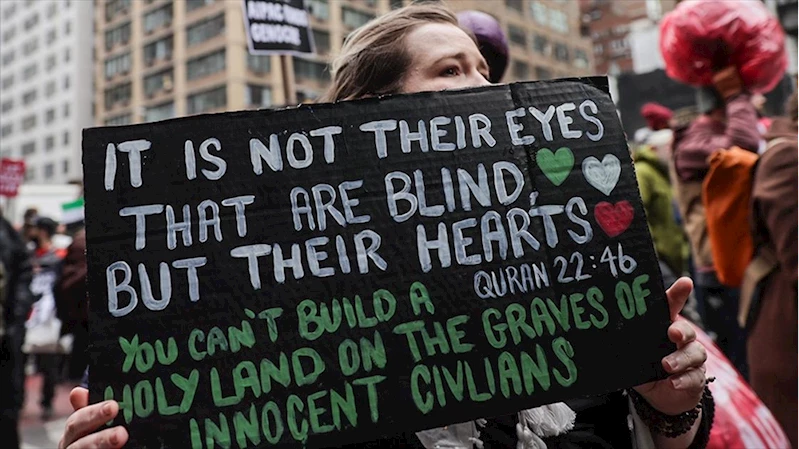ANKARA (AA) - New York Times'ın haberine göre, üzerlerinde "Ateşkes Hemen" yazan siyah tişörtler giyen ve ellerinde "Soykırımı finanse etmeyi durdurun" yazılı pankartlar taşıyan binlerce kişi, Manhattan'daki AIPAC binasının önünde toplandı.