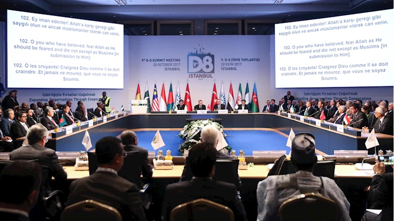 Üç kıtaya yayılan 8 ülke tarafından sosyoekonomik kalkınmayı temin etmek üzere kurulan D-8, çatışma yerine barış, meydan okuma yerine diyalog, sömürü yerine işbirliği, çifte standartlar yerine adalet, ayrımcılık yerine eşitlik, baskı yerine demokrasi ilkelerini temel alıyor.