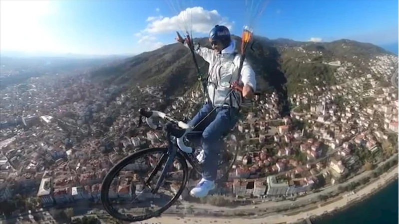 Ordulu yamaç paraşütü pilotu, havada bisikletiyle pedal çevirdi