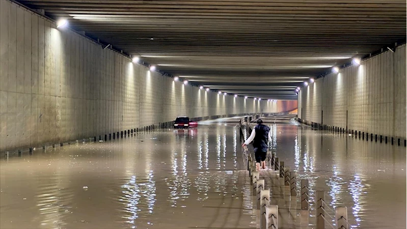 Bazı araçlar altgeçitte biriken suda mahsur kalırken, itfaiye ekipleri tıkanan mazgalları açmak için çalışmalarını sürdürüyor.