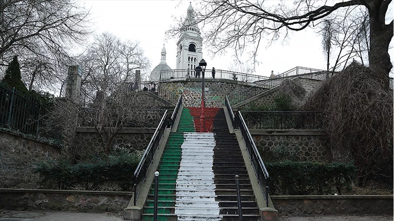 Şehrin en yüksek tepelerinden biri olan Butte Montmartre'de bulunan ve her yıl birçok turist tarafından ziyaret edilen Sacre Coeur Bazilikası'na çıkan merdivenler de Filistin bayrağı renklerine boyandı.