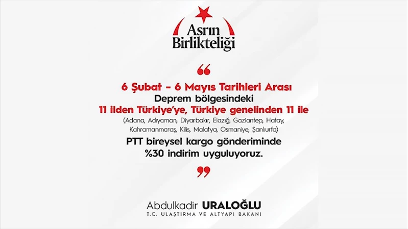 "Deprem bölgesine yapılan her gönderi bir umut anlayışı ile 6 Şubat-6 Mayıs tarihleri arasında Adana, Adıyaman, Diyarbakır, Elazığ, Gaziantep, Hatay, Kahramanmaraş, Kilis, Malatya, Osmaniye, Şanlıurfa illerimiz çıkışlı ve varışlı gönderilere güncel tarife üzerinden yüzde 30 oranında indirim uyguluyoruz."