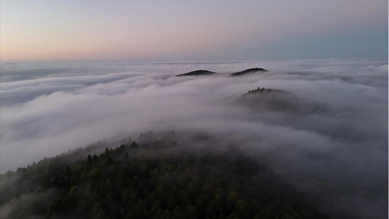 Bölgedeki tepelerin ve ormanların üzerini kaplayan sis bulutları görsel şölen sunuyor.