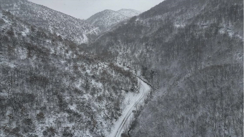 Beyaz örtüyle kaplanan ormanlık alanlar ve çevresi, drone ile görüntülendi.