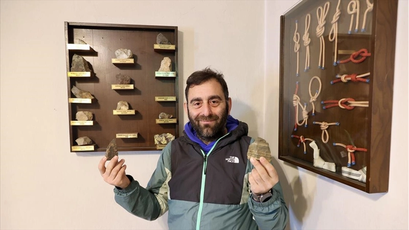 Sonbay, kent merkezinde 12 yıl önce açtığı kafede, tırmandığı zirvelerden topladığı taşların yanı sıra dağcı arkadaşlarına ait tırmanış malzemelerini de sergileyerek müşterilerinin ilgisini çekiyor.