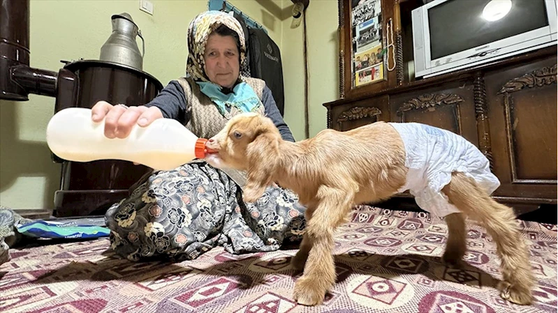 BURDUR (AA) - Kara çiftinin kendi ihtiyaçlarını karşılamak için köydeki evlerinin bahçesinde baktıkları keçilerinden biri doğum yaptı ancak sütü gelmeyince yavrusuna bakamadı. Kara çifti de soğuktan ve açlıktan ölmesin diye torunlarının ismini verdikleri oğlağı eve aldı.