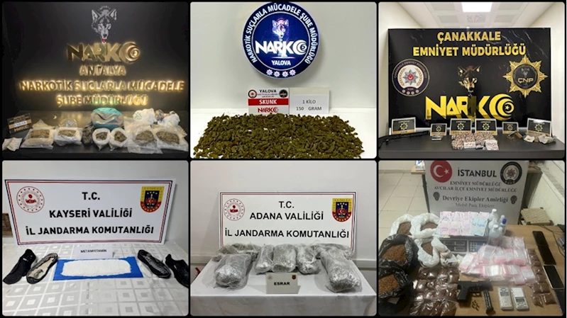 86 tondan fazla uyuşturucu madde, 105 milyon uyuşturucu hapAynı dönemdeki operasyonlarda 33 ton esrar, 26,6 ton metamfetamin, 20,8 ton skunk, 2,1 ton eroin, 1,9 ton kokain, 1,8 ton bonzai, 98 kilogram afyon olmak üzere yaklaşık 86,3 ton uyuşturucu madde; 89,4 milyon sentetik ecza, 10,3 milyon captagon, 4,9 milyon ecstasy olmak üzere toplam 104 milyon 600 bin uyuşturucu hap ile 112 milyon kenevir kökü ele geçirildi.