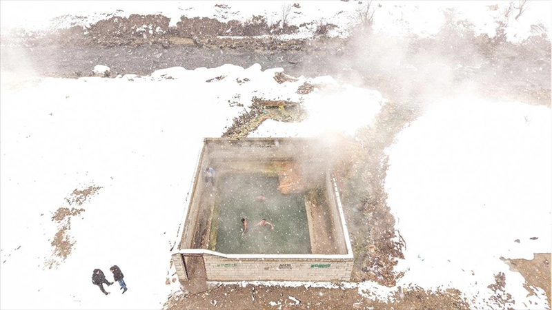 Hava sıcaklığının sıfırın altına düştüğü bölgede kar yağışı altında havuza giren vatandaşlar, sıcak suda yüzüyor.