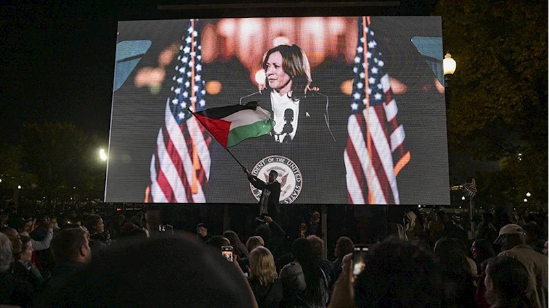 Harris'e Gazze protestosuHarris'in konuşmasına devam ettiği sırada yaklaşık 300 kişiden oluşan kalabalık grup, Filistin ve Gazze lehine sloganlar attı ve Biden-Harris yönetimini protesto etti.