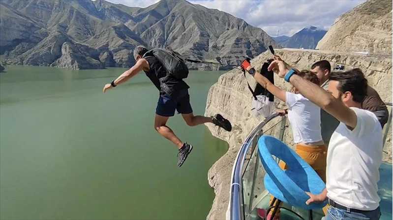 "Yarasa adam" 143 metredeki cam terastan atlayıp Tortum Gölü'ndeki bota indi