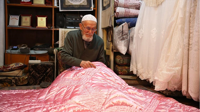 "Şerafettin dede", iğne ve ipliğiyle 72 yıldır dolgusu pamuk veya yün olup bölgede hala talep gören saten yorganları titizlikle işliyor.