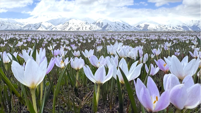 Karla kaplı Cilo Dağları'yla bütünleşen mor ve beyaz renkli çiçekler, seyrine doyum olmayan manzaralar oluşturdu.