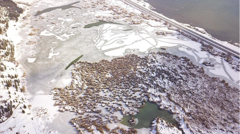 Çevresi beyaz örtüyle kaplanan sulak alan dronla görüntülendi.