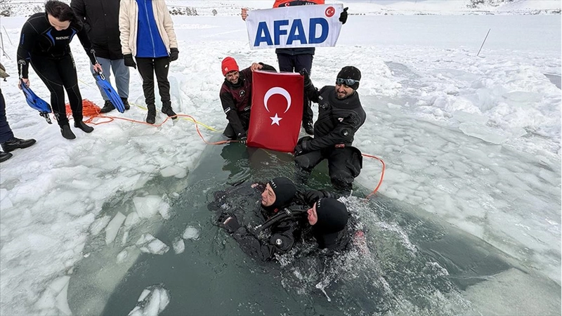 ARDAHAN (AA) - ARDAHAN (AA) - GÜNAY NUH - İskenderun Teknik Üniversitesi (İSTE) Denizcilik Teknolojileri Meslek Yüksekokulu akademisyen ve öğrencileri, yüksek irtifa buz altı dalışlarında deneyim kazanmak amacıyla yüzeyi buzla kaplı Çıldır Gölü'ne daldı.