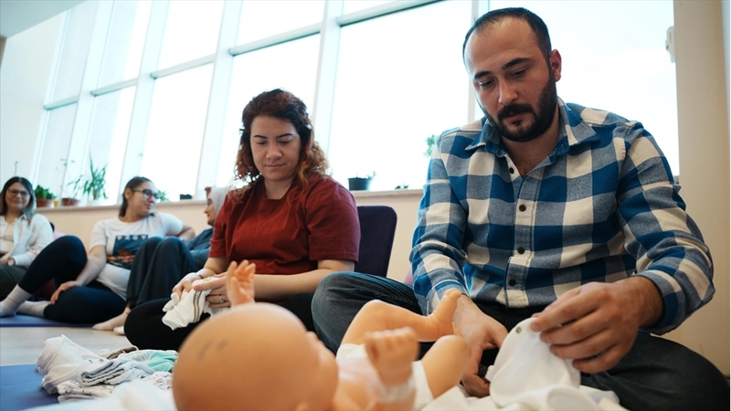 Anne adaylarıyla birlikte eğitimlerin bazı bölümlerine katılan baba adayları da yenidoğan bakımı, gebelik ve lohusalık sürecinde eşe verilmesi gereken destekler konusunda bilinçlendiriliyor.